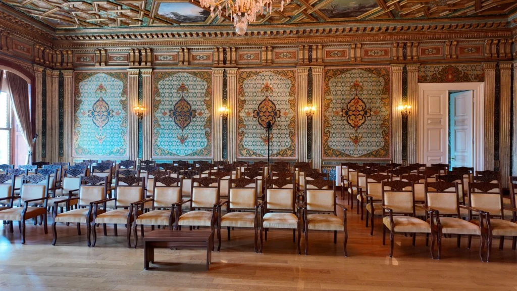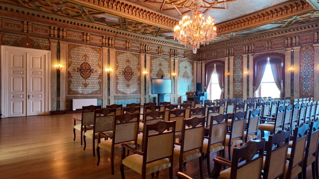 Imagine you are showcasing your ideas at the Royal Rectorate Building of Istanbul University, one of the most historic and architecturally resplendent venues in Türkiye. Here is a royal-style description followed by some intriguing facts about the venue: